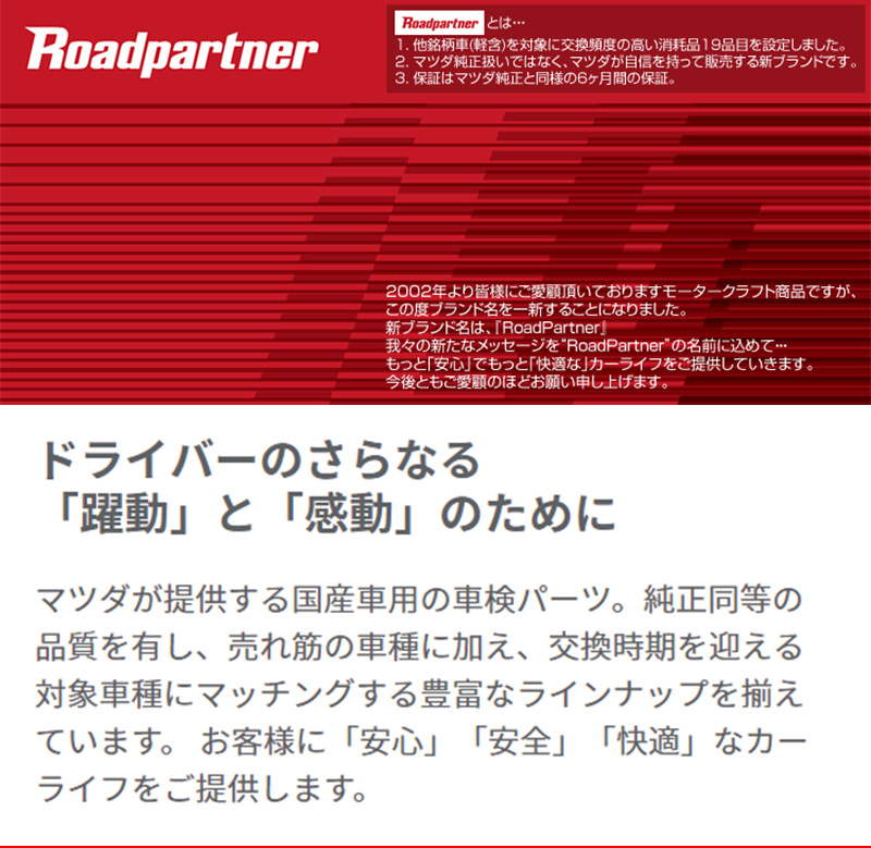 マツダが提供する国産車用の車検パーツ。純正同等の品質を有し、売れ筋の車種に加え、交換時期を迎える対象車種にマッチングする豊富なラインナップを揃えています。 お客様に「安心」「安全」「快適」なカーライフをご提供します。